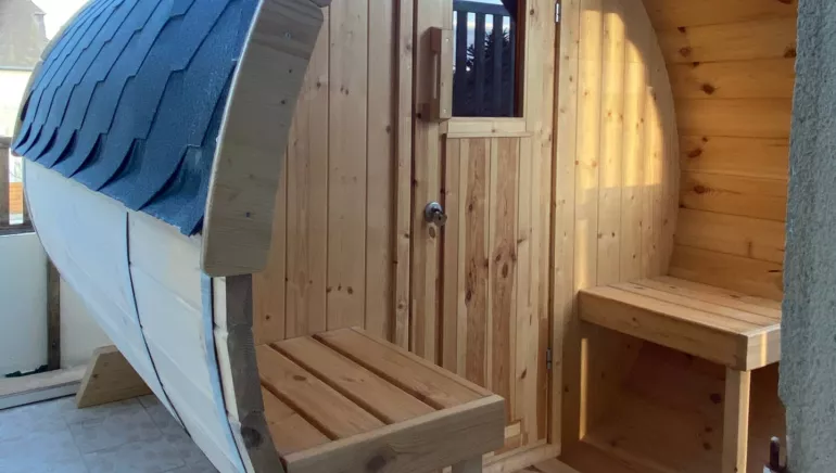 Upstairs, a Zen-style bedroom facing the sea, queen-size bed under a starry LED sky. Herbal tea room and fitness area facing the sea, with an en suite whirlpool bath in front of the bay window and hydromassage bed. Large sensory shower opening onto the terrace where you will find the sauna equipped with a Huum stone stove. WC.