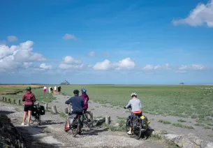 Genießen Sie umgeben von Grasland und Salzwiesen den fantastischen Blick auf den Mont-Saint-Michel und die kleine Gezeiteninsel Tombelaine.