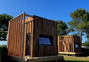 Cet hébergement en bois de 8m² isolé peut accueillir jusqu’à 3 personnes, il est équipé d'une table fixe avec des tabourets. Un branchement électrique permet d'y recharger les VAE.