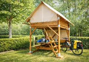 Dans ce camping de charme de 4*, cette cabane surélevée est particulièrement adaptée aux cyclotouristes de passage. En hauteur on y trouve une terrasse ainsi que la partie nuit avec 2 lits de 90x190. Au sol : un coin repas abrité avec réfrigérateur et plaques de cuisson.
