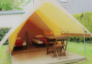 Le camping 3* le Frêche à l'Âne à Pléboulle met en location à la nuitée 2 modèles de tentes sur plancher en bois. L'une est équipée d’un lit double, l'autre de 2 lits simples.