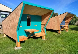 4 Cabanes étapes vous accueillent face à la mer au Camping Municipal Les Fauvettes à Binic-Étables-sur-Mer. Chaque cabane est composée d'un lit douillet double, un espace pique-nique à l’abri avec table et chaises, et de quoi ranger vos sacoches.