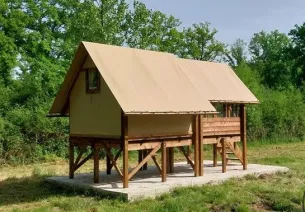 Une autre version de cette cabane en bois et toile est également disponible à la location à la nuitée.