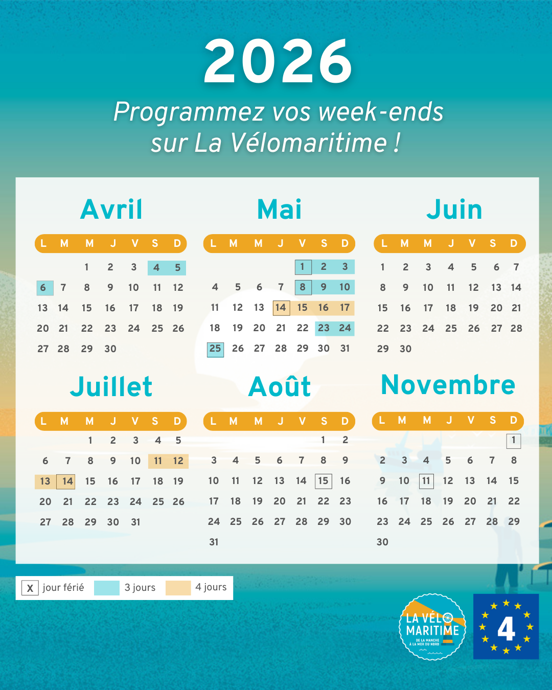 🗓️ Le calendrier 2026 est une véritable invitation au voyage ! Avec 4 week-ends prolongés (dont les lundis de Pâques et de Pentecôte) et des opportunités de ponts en mai et juillet, les occasions ne manqueront pas pour s'évader 🚴♀️. C’est le moment idéal pour planifier vos étapes sur La Vélomaritime et explorer nos côtes, de la Manche à la Mer du Nord 🥳.