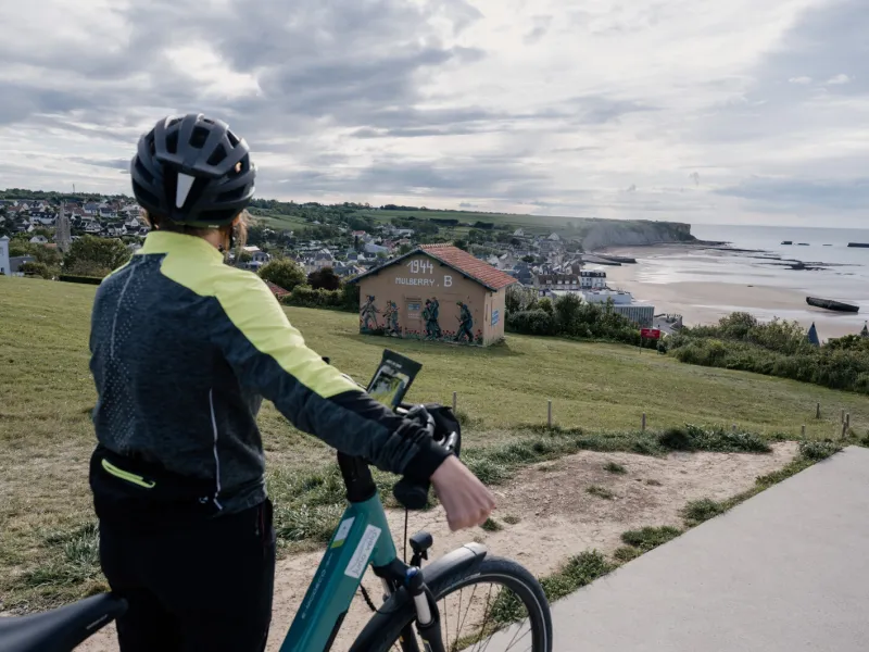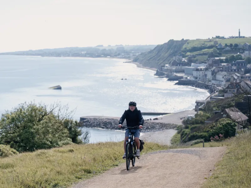 Stromaufwärts von Port-en-Bessin sieht die Route eine vorübergehende Umgehung zurück zur Küste vor. Wenn Sie sich für einen Ausflug nach Port-en-Bessin entscheiden, müssen Sie Ihre Schritte zurück nach Huppain zurückverfolgen, um die markierte Route über Etréham zu finden. Auf der Höhe der Batterie Longues-sur-Mer erreichen Sie wieder die Küste. Von dort radeln Sie auf einem Voie Verte-Radweg bis nach Arromanches.